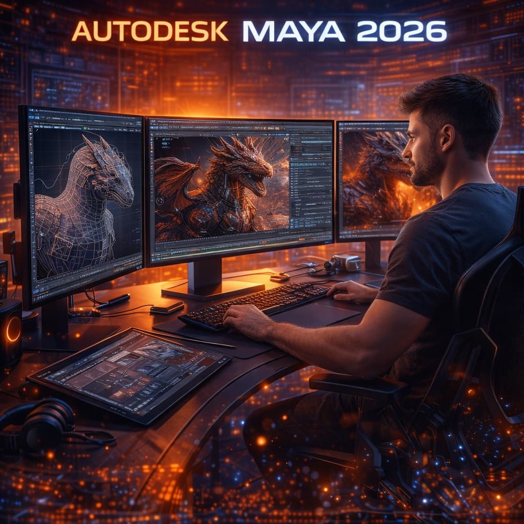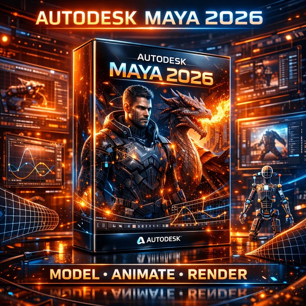 Transforme suas criações com o Autodesk Maya 2026 – o software líder mundial 🌍 em modelagem 3D, animação e efeitos visuais, utilizado por estúdios de cinema, jogos e artistas digitais que exigem máxima qualidade e realismo.