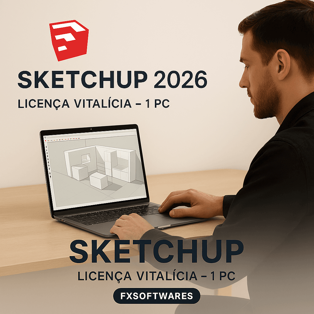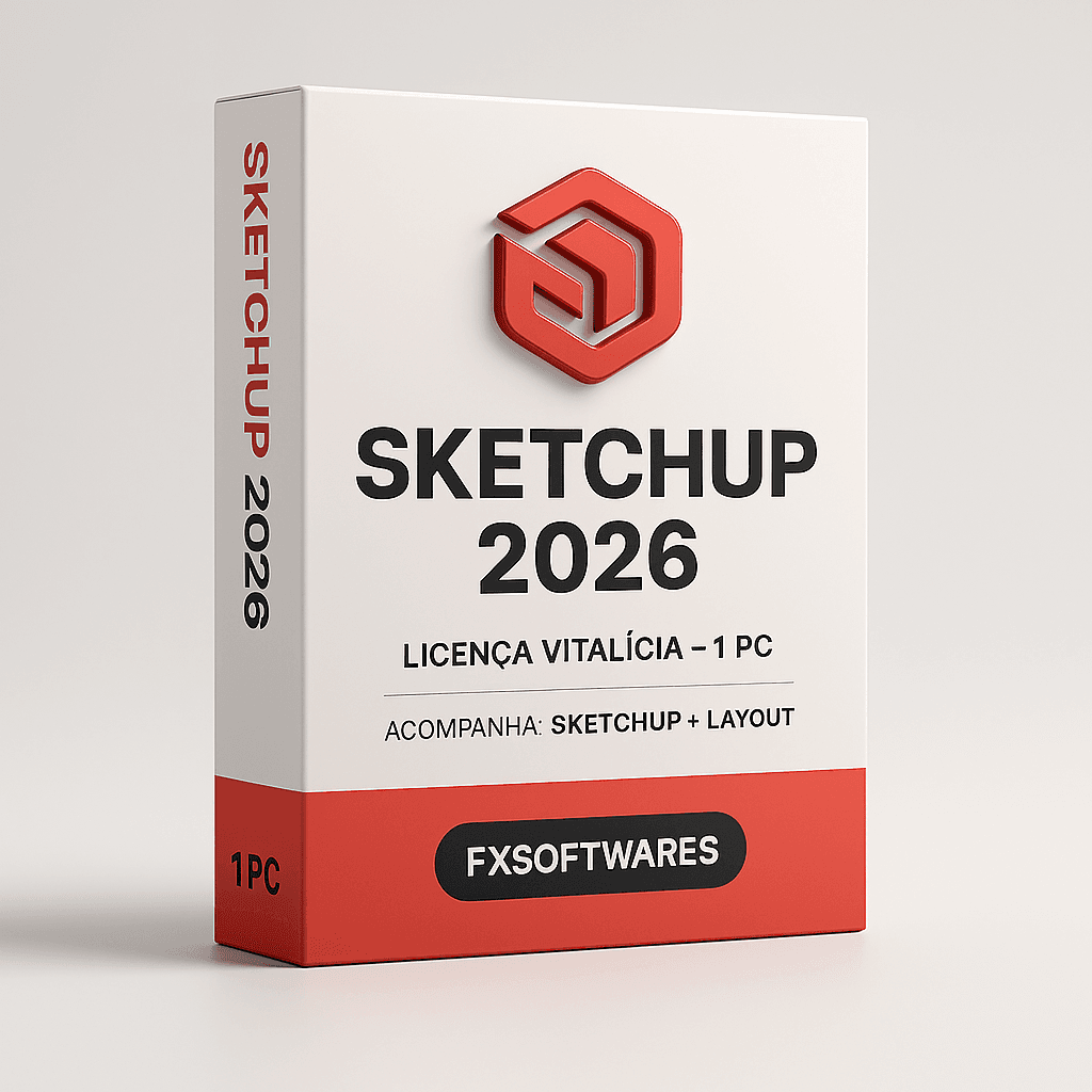 Compre SketchUp 2026 licença vitalícia ⭐⭐⭐⭐⭐ para 1 PC. Inclui SketchUp + LayOut, biblioteca online via login e versão permanente sem atualizações. Modelagem 3D profissional para arquitetura, interiores, engenharia e design. Veja requisitos de hardware!